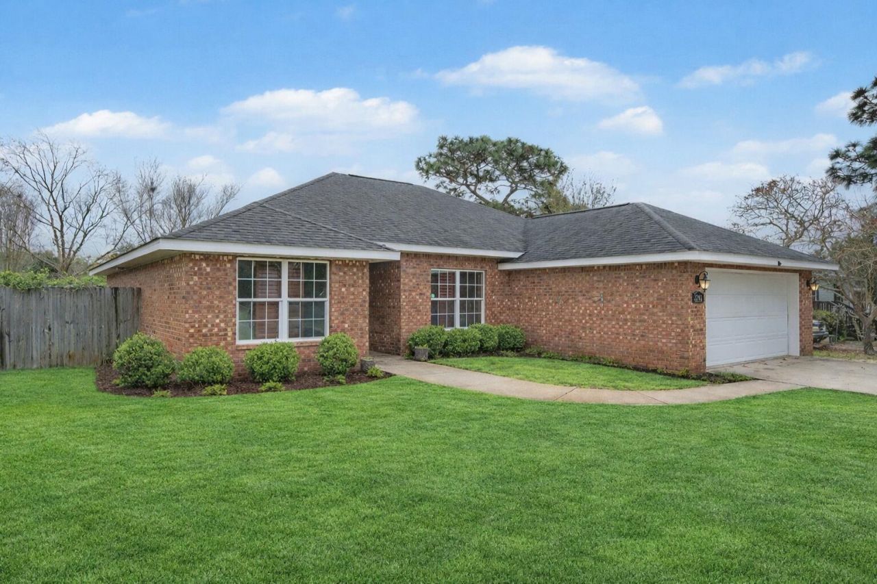 Located just across the county line past Hurlburt Field, this inviting 4-bedroom, 2-bath home offers a spacious open-concept layout designed for comfortable everyday living and easy entertaining. The versatile fourth bedroom can serve as either a guest room or a private office, giving you flexibility to fit your lifestyle. Inside, beautiful hardwood floors flow throughout the main living spaces, complemented by vaulted ceilings that enhance the home's bright and airy feel. Dark wood plantation shutters throughout add both style and privacy. The large breakfast bar opens to the dining area and expansive family room, creating the perfect gathering space. A unique highlight of the home is the oversized movie screen built right into the great room wall--perfect for movie nights, sports, or gaming. Step outside to enjoy the large backyard featuring a covered patio for entertaining, a generous storage shed, and a custom outdoor shower. Conveniently located with quick access to Hurlburt Field and the beautiful beaches of Navarre--and with no HOA--this home offers comfort, character, and coastal convenience.