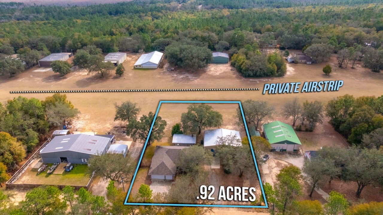 Welcome to 526 Tail Spin Drive in Holt, Florida--an aviation lover's dream with private runway access from your backyard. Taxi from your own hangar, featuring a bifold airplane door, and dedicated office space, straight to the skies. The property also offers a two-car attached garage and an outdoor living area with fireplace, perfect for gathering after a day of flying. A fenced dog run adds function and flexibility. This airpark home blends everyday comfort with the rare ability to live where you fly. Enjoy expansive views as aircraft arrive and depart, creating a backdrop unlike any traditional neighborhood. Designed for pilots, collectors, and those who crave open sky, this property delivers function and character in equal measure. Live where your runway meets your retreat. Fly home.