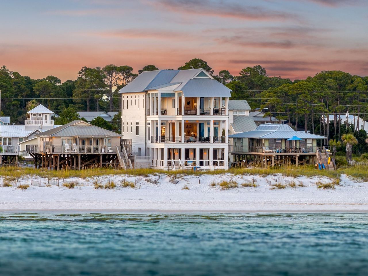 Boundless views and unforgettable beach days define this newly built gulf-front residence designed by Geoff Chick and completed in 2023. This architectural masterpiece rises along the shoreline, where walls of glass frame the ever-shifting colors of the Gulf of Mexico and Oyster Lake. Expansive balconies and a seamless indoor-outdoor flow create a living experience that feels both modern and timeless.The main level offers a soaring great room where sliding glass walls dissolve into the horizon, a gas fireplace anchors the space, and a quartzite-clad kitchen with a butler's pantry inspires culinary creativity. Gather around the oversized island or take meals to the covered gulf-front terrace where the water provides the backdrop. Beach-level living is equally impressive with a screened entertainment terrace featuring a fire pit, outdoor kitchen with vented grill, and Jacuzzi for sunset soaks. A powder room and outdoor shower add convenience, while private beach access ensures days begin and end in the sand.Five ensuite bedrooms, including a bunk room, each open to balconies with gulf or lake views. A main-level suite provides accessibility, while the top-floor primary retreat boasts cathedral ceilings, a private furnished balcony, and an ensuite beverage bar for morning rituals. Dual laundry rooms, elevator service to all floors, and abundant storage ensure every need is met. Additional features include 12 foot ceilings on all floors, a Tesla EV charger, two-car garage, and a whole-house generator. This masterfully designed gulf-front residence offers an elevated coastal lifestyle, where design, comfort, and nature converge in perfect balance.
