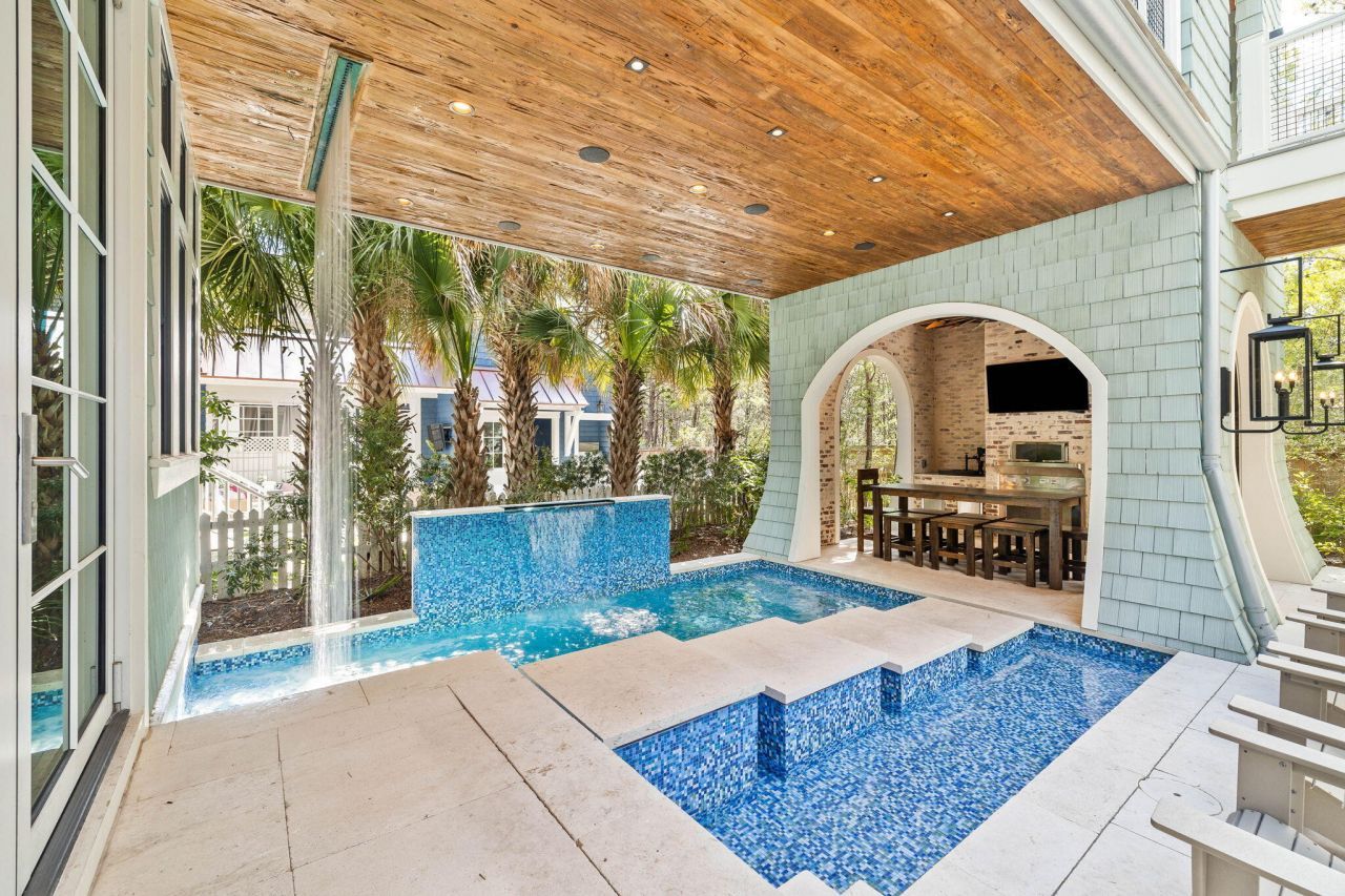 Welcome to 58 Coopersmith, a unique offering within the gated confines of Watersound Beach. Backing up to Deer Lake State Park, the location marks the perfect setting for this custom built home featuring elements not seen in its surrounding neighbors. The New England architecture blends perfectly with rustic elegance. Such features include solid hand-hewn beams accenting various areas of the home and holding center stage in the open floorplan living/dining/kitchen area, custom reclaimed wood floors throughout the home, and various ceiling and wall accents of reclaimed barn wood and pecky cypress. Truly an entertainer's dream, the main level was designed to merge indoor and outdoor living by simply opening the nano doors from the living area to the backyard oasis. There you will find a Miami inspired pool with illuminated steps and waterfalls leading to a covered patio area with outdoor kitchen, fireplace, and built-in pizza oven. Adjacent is another accordion style door opening to a game room with a ping pong table, bar with kegerator and multiple tv's along with a full bath. Barn style doors connect this room to the garage. Moving back into the main living level of the home you will find a kitchen designed for a true culinary connoisseur. An illuminated crystallo countertop showcases the kitchen island surrounded by a lavish appliance package including a Wolf 6 burner range, large Sub-Zero refrigerator, and a pantry area with an Irinox blast chiller and vacuum sealer. Adjacent to the kitchen area is an additional wet bar with a standup wine cooler. The living room is complemented by the beautiful gas fireplace and immense natural light. The main level also includes a powder room, laundry area with reclaimed barn doors, and one of the two master suites complete with an astonishing bathroom. Choose either the 3 stop elevator or the custom designed staircase to take you upstairs to the second floor where you will find another master suite, 2 guests suites, living room, powder room and wet/coffee bar. The primary suite on this floor has its own wet bar, vaulted ceilings with hand hewn beams, walk-in closet and luxurious bathroom. The 2nd floor living area leads you out to the deck connecting you to the only free-standing tower in Watersound, complete with multi-floor patio areas leading to the top where you can take in the Gulf views. Above the garage is a separate apartment area currently being used as a theatre room with electric roll down shades and projector screen. A murphy bed is integrated for those extra guests. The 3rd floor is designed for the little ones, featuring a multitude of large bunks and built-ins and topped off with an amazing bath with a reclaimed wood beam vanity. Watersound Beach offers pristine amenities and is situated in the heart of 30A. Enjoy some of the most scenic views in our area from the boardwalks leading across the preserved dune structure taking you to the large stretch of private beach.