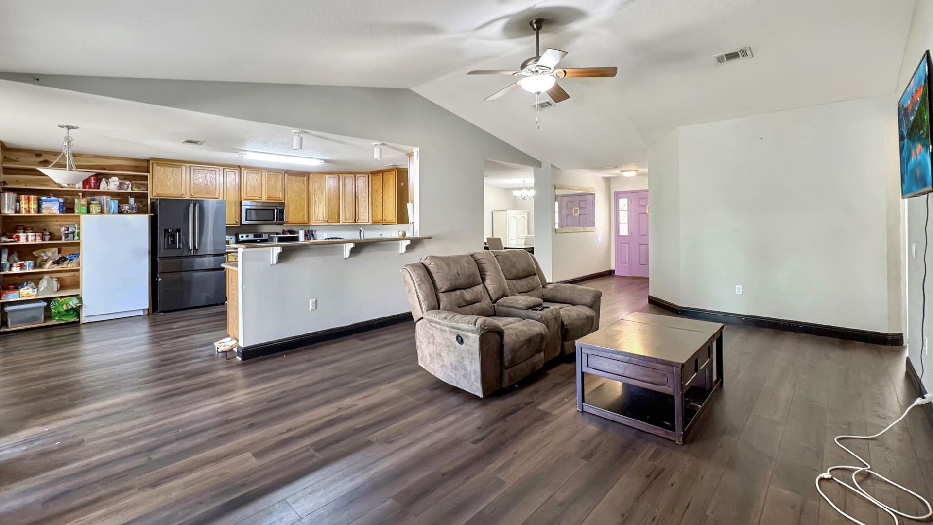 Welcome to a home where space, comfort, and everyday living come together effortlessly. From the moment you arrive, the expansive lot and oversized driveway set the tone offering plenty of room for guests, gatherings, and the freedom to truly enjoy your surroundings. Step inside and you're immediately greeted by a sense of openness, with a generously sized living room that invites you to relax, unwind, and make lasting memories. The heart of the home is the beautifully designed kitchen thoughtfully laid out with a large center island that becomes the natural gathering place for morning coffee, casual meals, or entertaining friends and family. With abundant space to cook and connect, this kitchen is both functional and welcoming. Just beyond, sliding glass doors fill the home with natural light and lead to a covered patio overlooking the backyard, creating a seamless indoor outdoor flow. Imagine opening those doors on a breezy afternoon and enjoying quiet mornings or relaxed evenings in your own outdoor space. With five spacious bedrooms and three full bathrooms, the layout offers flexibility for a variety of living arrangements. The primary suite features a private bathroom, while one additional bedroom also includes its own attached bath. The remaining bedrooms share a full guest bathroom, providing both comfort and convenience.This home offers the space to live, gather, and grow inside and out.