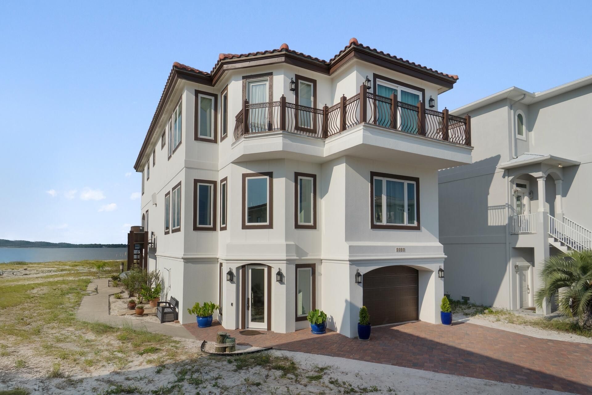 Exquisite Waterfront Residence in Sailmaker Cove. Step into a world of luxury and authenticity, nestled within a prestigious gated community, the home offers unique character and essence.This custom-built residence seamlessly blends timeless coastal design with elevated Mediterranean elegance. Forever views, surrounded by the serene landscape of Gulf Islands National Seashore. Upon arrival, the property makes an immediate impression with its elegant white stucco exterior and Spanish cement tile roof, complemented by a beautifully designed wrought iron balcony offering captivating views of the Gulf and it's pristine sugary beaches. Spanning over 3,794 square feet, this meticulously curated 4-bedroom, 5-bathroom home is designed to elevate your lifestyle and spirit. The first floor features an open-concept layout, perfect for gatherings, that effortlessly integrates into a chef's dream kitchen, adorned with high-end, custom solid wood cabinetry and stone countertops. Imagine dining while savoring breathtaking sunsets from the comfort of your home.Additional highlights of the first floor include a spacious bedroom suite with a luxurious bath. Tiles and hard wood flooring and a host of subtle custom finishes thoughtfully designed throughout the home such as imported sinks, a stunning cement wall for showcasing your favorite wines, and exquisite 19th-century European stained glass above bedroom doors and throughout selected walls really showcase this spectacular home. The spacious primary suite on the second floor serves as a true retreat, boasting a cozy sitting area, custom built-ins, and a private balcony with breathtaking views of the Gulf. Two additional guest bedrooms, each with en-suite baths and picturesque views of the sound and national park, provide ample space for family or guests.The garage is equally impressive, with high ceilings and generous storage space, including an area designed for a golf cart.The rear exterior of the home is perhaps its most enchanting feature, inviting you to relax or entertain at any time of day while being embraced by nature. Whether you prefer watching dolphins swim or enjoying a peaceful read, this unique setting promises to be a spectacular experience.Conveniently located just across from a tranquil, less-crowded beach. Take a short, scenic ride through the park to the vibrant Pensacola Beach for an array of dining and entertainment options. Sailmaker Cove provides a serene gated community experience, bordered by natural beauty, including the stunning Santa Rosa Sound.Residents also have access to the refreshing community pool, making this property an ideal choice for a primary residence, vacation home, or a lucrative short-term rental opportunity. This home is truly a rare gem that will not disappoint!