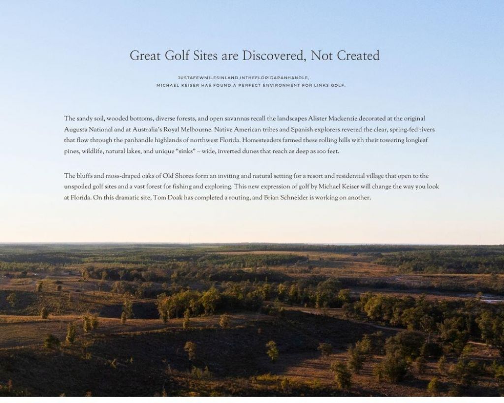 Located in Florida's panhandle, just inland from the gulf's sugar sand beaches, Old Shores will be a new community anchored by golf - a refuge, with world-class courses, accommodations, and homesites. Located just 30 minutes north of Panama City Beach, the land will serve as a peaceful, secluded escape and is an easy day drive from a wide variety of neighboring cities and states. The bluffs and moss-draped oaks of Old Shores form an inviting and natural setting for a walking village that opens to the unspoiled golf sites and a vast forest with lakes for fishing and exploring. This new expression of golf by Michael Keiser will change the way you look at Florida. The initial course, by Tom Doak, is underway, with another in design. Upon some 5,000 acres of sand hills and forests in the Florida panhandle. Here, residents and guests alike will find world-class golf courses built in harmony with the land and friendly, welcoming hospitality. A walkable village opens to outdoor recreation, food, and art.